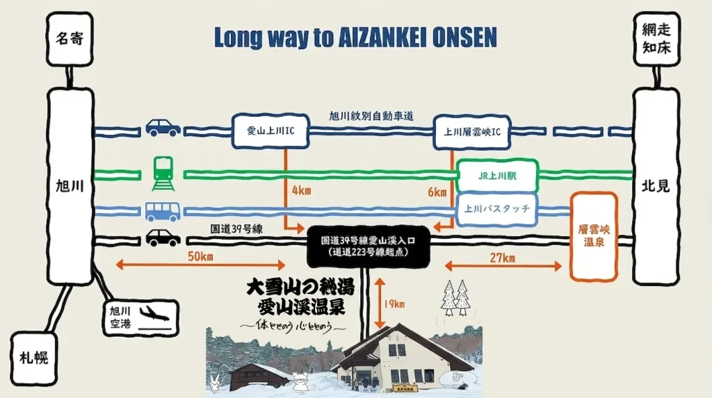 | ・国道39号線から全線舗装された道路でお越しいただけます。 ・9月下旬以降は雪が降る可能性がありますので、冬用タイヤなどの準備の上でお越しください。 ・上川駅から愛山渓温泉までは公共交通機関の運行がありませんのでタクシーをご利用ください。(JR上川駅より約25km) |